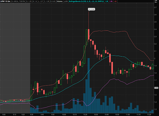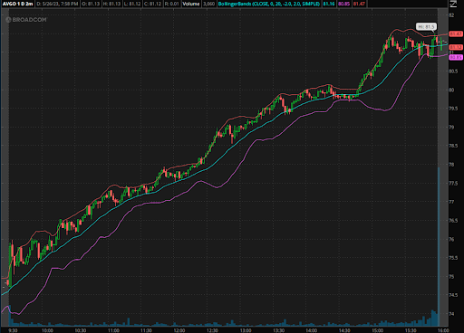 AVGO opens strong again, but this time the behavior is radically different. The slope steepens rapidly. Candles grow with each bar. Price accelerates far outside the Bollinger Band and way above the moving average.